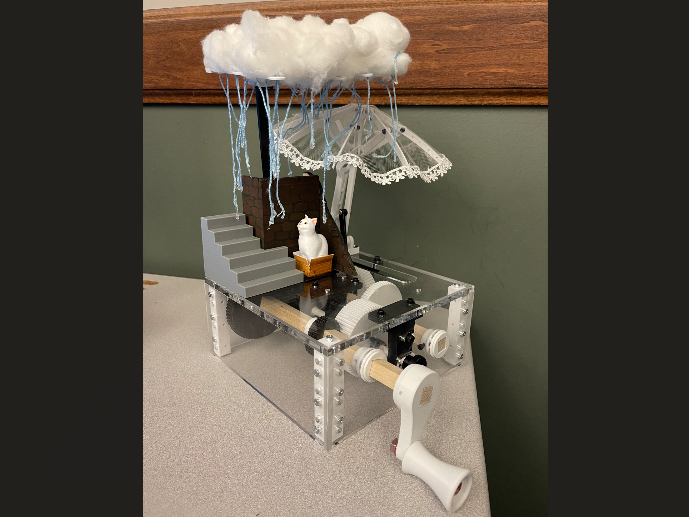 Open the umbrella by pressing a button to protect the shivering cat from the heavy rain!