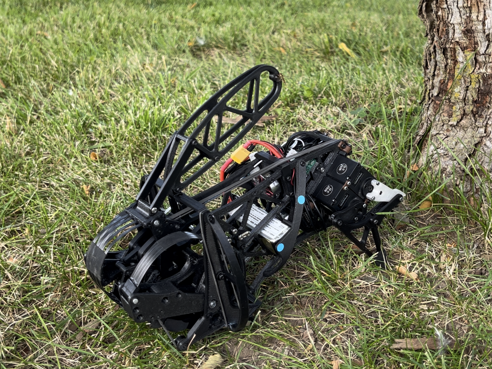 “Pinto” is a squirrel robot that hops around and jumps onto the tree. It is a bio-inspired robot created to mimic the agile motions of a squirrel.